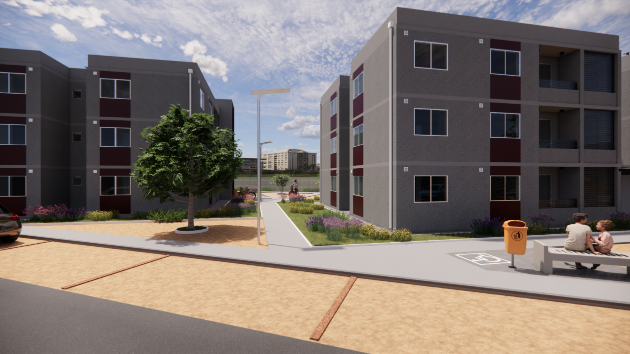 Proyecto correspondiente a condominio Tipo A, de 80 departamentos, conformado por 5 edificios de 16 departamentos cada uno. Cuenta en con una sala multiuso, portería y áreas verdes de recreación, esparcimiento y deporte. Correspondiente a postulación de subsidio colectivo para “Construcción en Nuevos Terrenos (CNT)”, acogida al DS49 (de V y U), en la Comuna La Florida, en la Región Metropolitana, Chile.